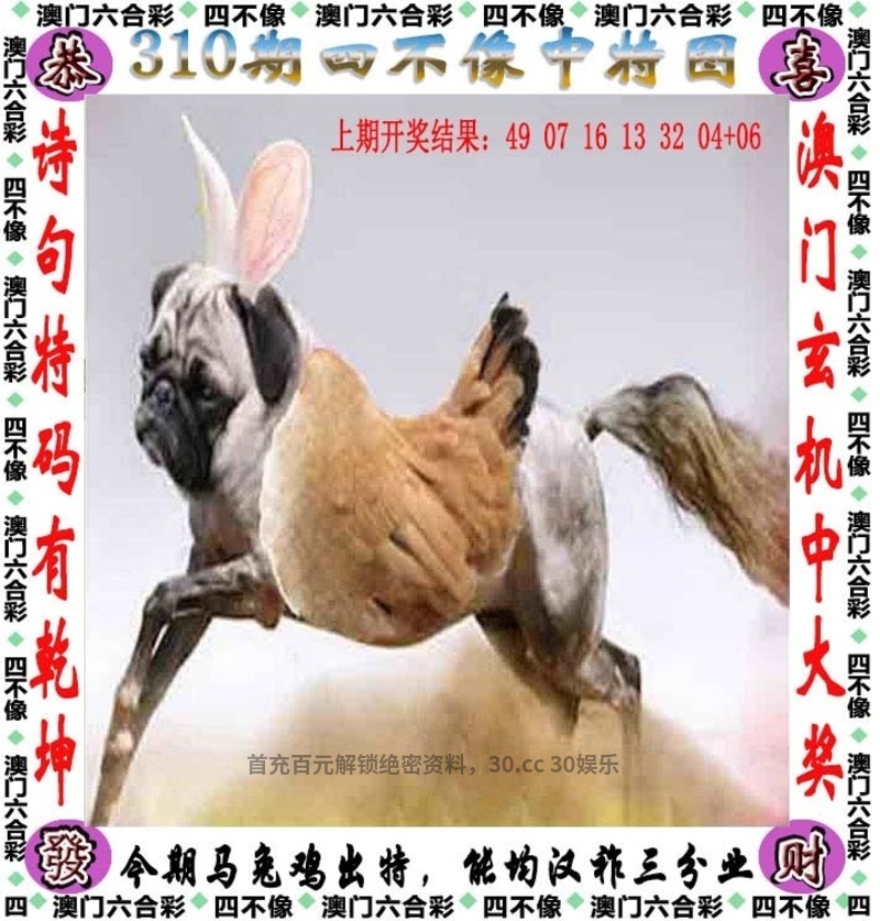 | 307期九肖 | 蛇龙兔虎猴马狗猪鸡 | 開:狗20 |